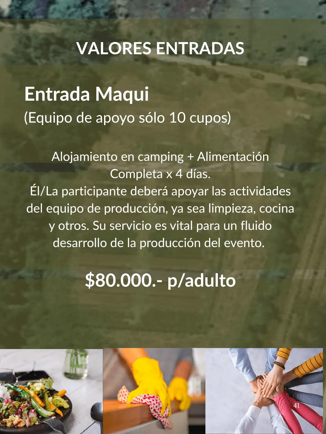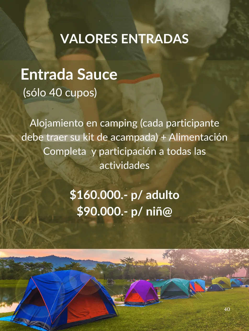 Alojamiento en camping (cada participante debe traer su kit de acampada) + Alimentación Completa y participación a todas las actividades