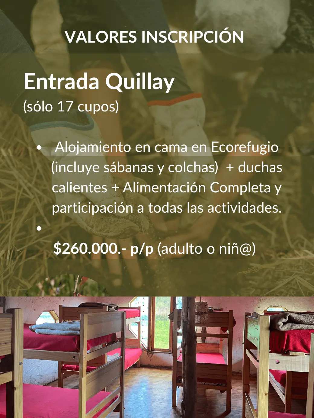 Alojamiento en cama en Ecorefugio (incluye sábanas y colchas) + duchas calientes + Alimentación Completa y participación a todas las actividades.